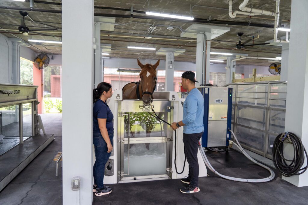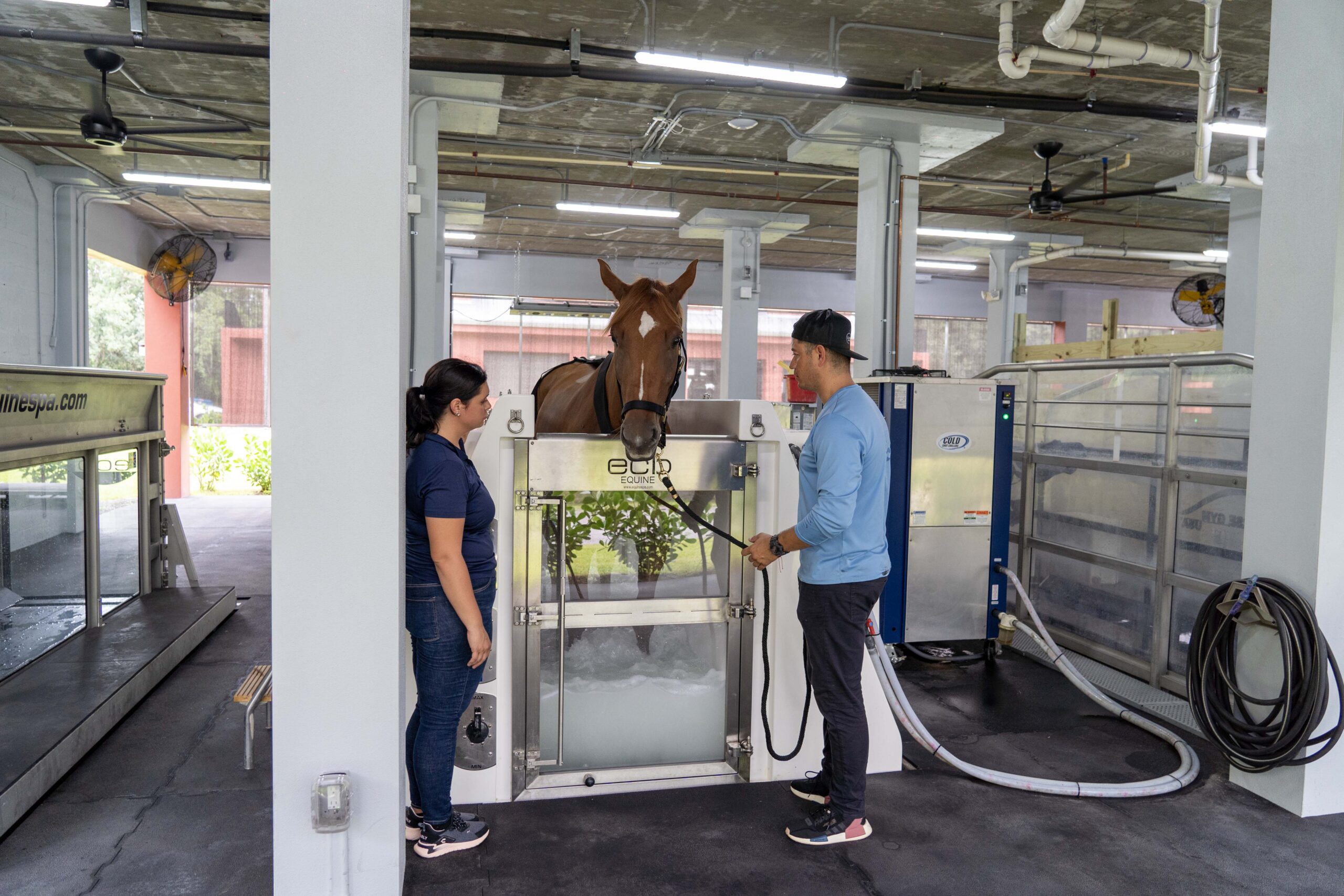 ECB hydrotherapy allows the introduction of higher salt levels than seawater, increasing its potential healing powers. This salt level also acts as a poultice to draw out heat and infectious fluids. Aeration of the water increases the dissolved oxygen content and creates a massaging effect. Hard to reach problem areas like stifles can be teated using the cold hose attachment with cold saltwater alone or in conjunction with a Spa treatment. Case studies show the efficacy of using cold salt therapy to heal tendon tissue as well as extreme wounds.